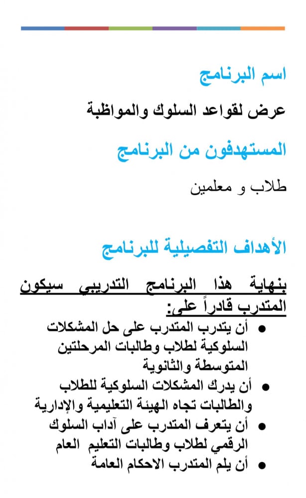 حقيبة تدريبية عن عرض لقواعد السلوك والمواظبة للمرحلة المتوسطة والثانوية