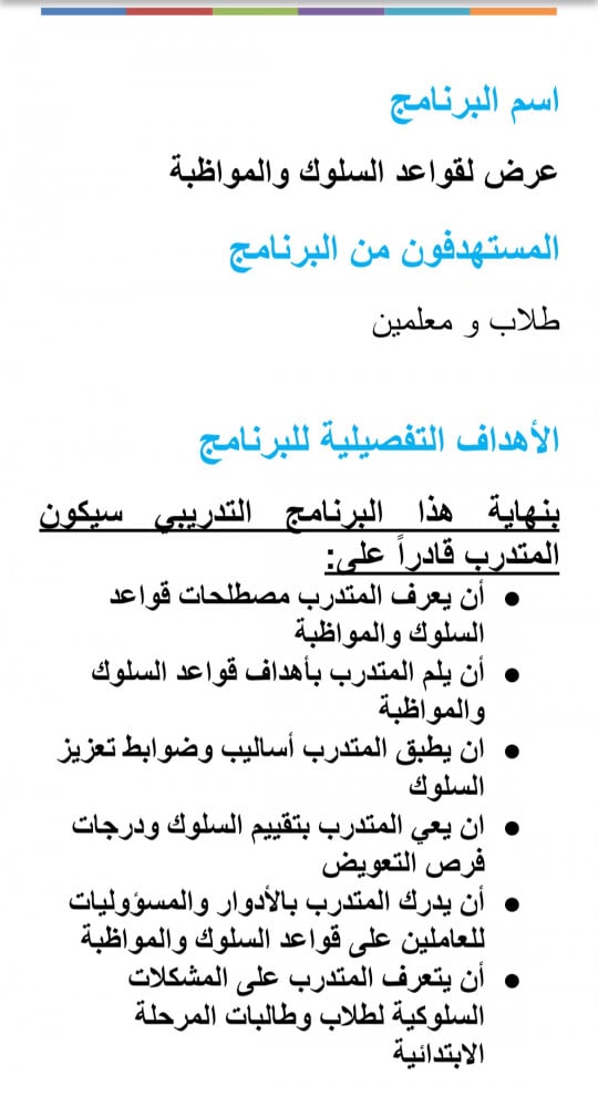 حقيبة تدريبية عن عرض لقواعد السلوك والمواظبة للمرحلة الابتدائية